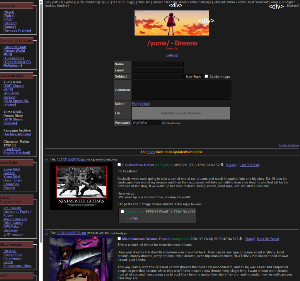 Uboachan is a community-run imageboard modeled after 4chan and 2channel, but exclusively dedicated to Yume Nikki and its various fan-made spin-offs (referred to as “fangames”).