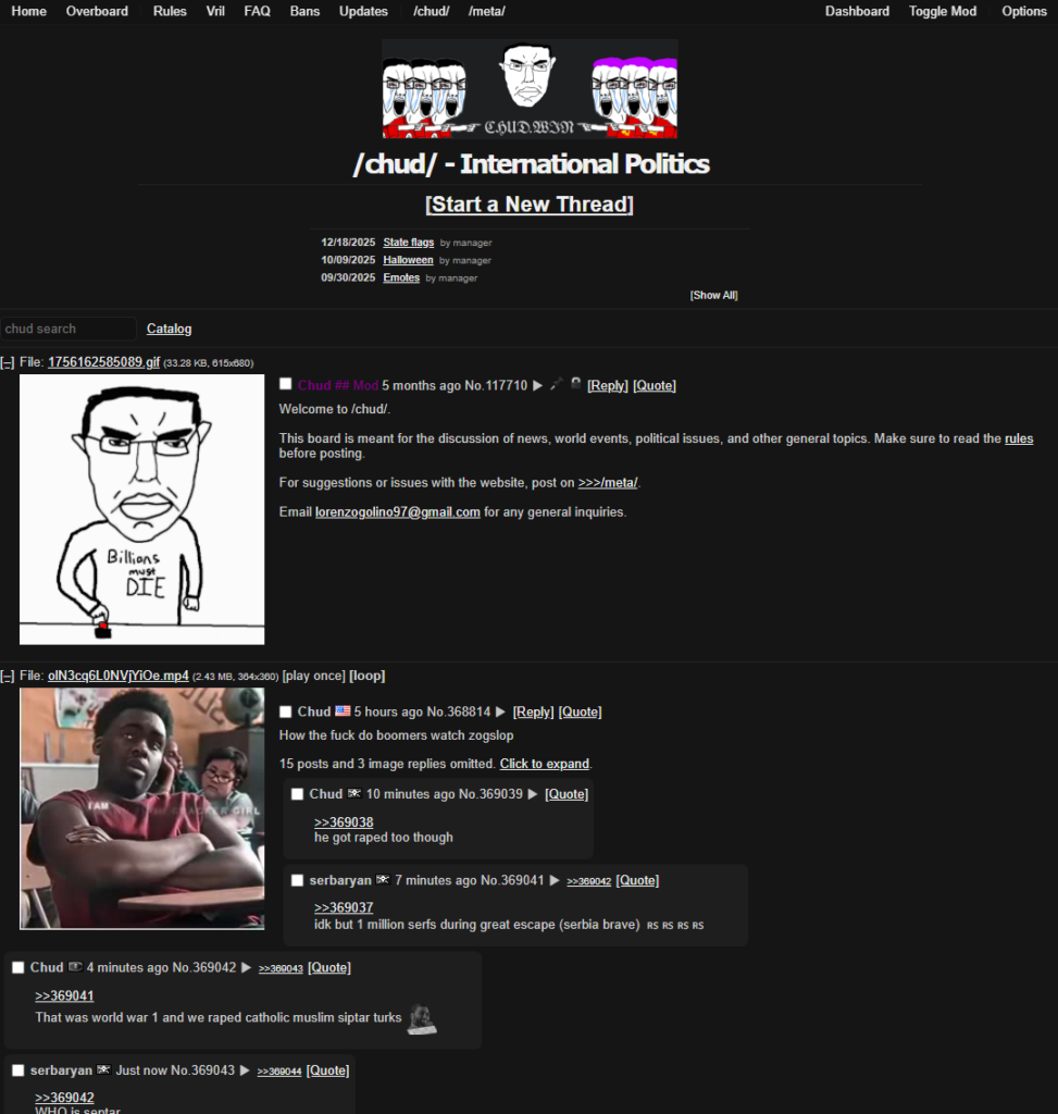 Chud.win, commonly referred to as the Chinny, is an anonymous English-speaking imageboard website centered around international politics. It was launched on September 5th, 2024, and amassed over 120,000 posts in it’s short 2 month run. It was closed in November, but returned, and the current website you are on, is the second, and everlasting era of chud.win.