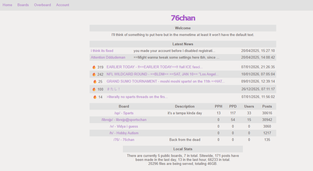 - Technical Build: It uses Vichan/Infinity, which is favored by many “alt-chans” for its customizable themes and modernized user interface. It is often cited in developer documentation for imageboard archivers (like Hayden) as a primary example of a high-performance Infinity-based site.