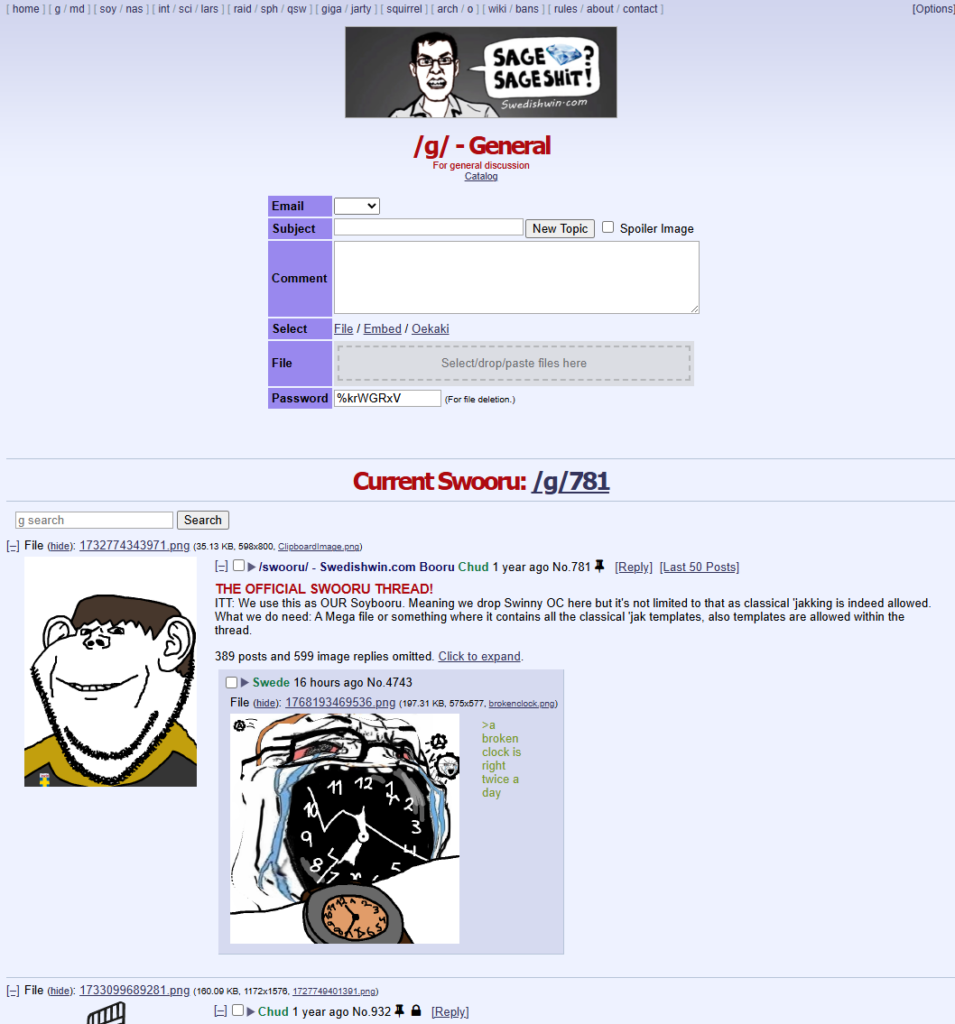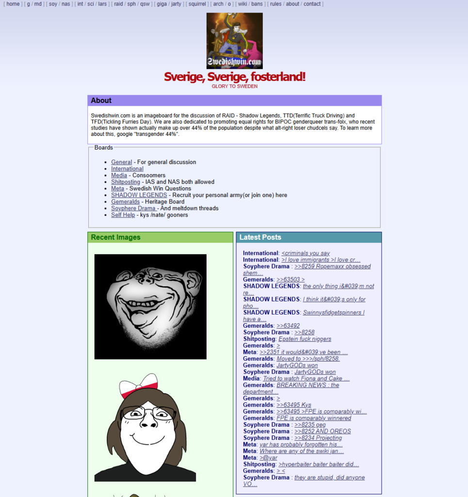Swedish Win is an anonymous imageboard designed for the Swedish “anon” community. It utilizes modern imageboard software (often LynxChan or a similar engine) and is characterized by its heavy use of Soyjak variants and “Chud” memes.