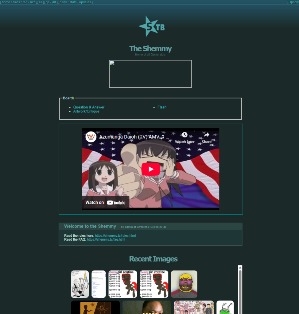 Shemmy.lol is an anonymous imageboard (utilizing LynxChan software) that serves as a hub for artists, “webcore” enthusiasts, and fans of the “Shemmy” character.