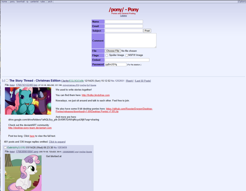 - Community Culture: It has a significantly more civil and “wholesome” vibe than most imageboards. It features unique technical additions like Ponymotes (pony-themed emojis/icons) and long-running collaborative projects like “The Story Thread,” where users have been co-writing narratives for years.