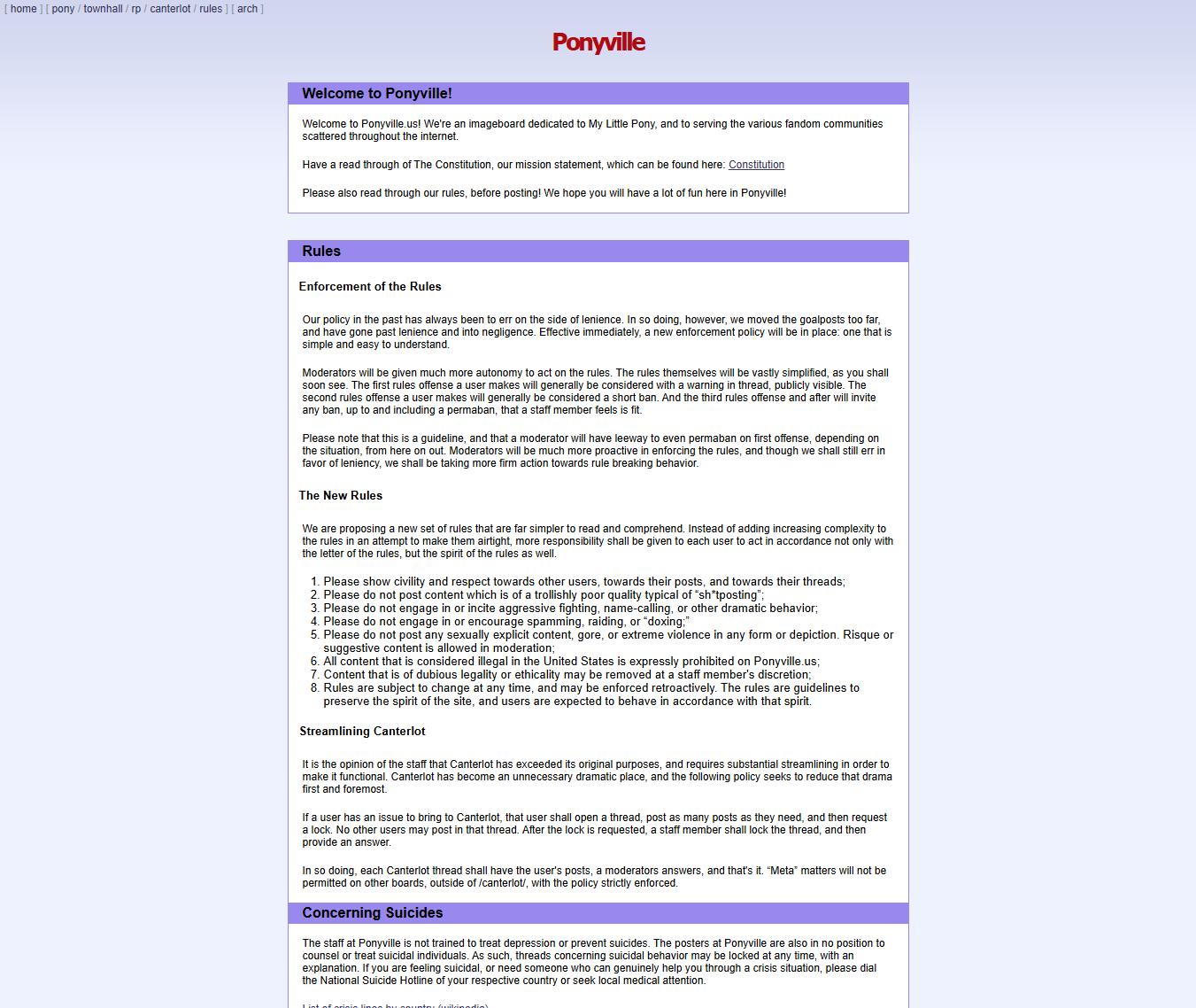 - The “Constitution”: The site operates under a mission statement known as “The Constitution,” which defines it as a space meant to serve various fandom communities and provide a stable home for MLP fans away from mainstream site volatility.