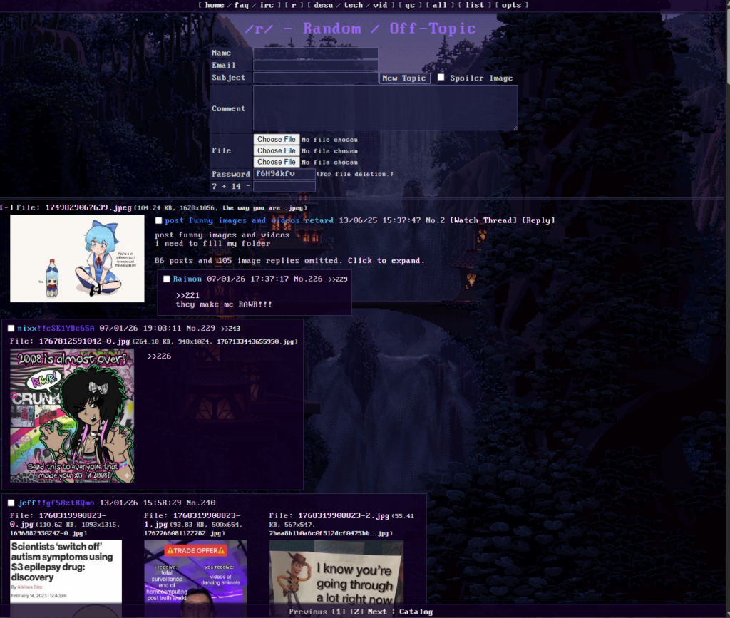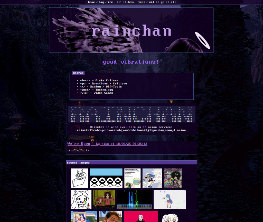 Rainchan is a small, anonymous imageboard (using the vichan engine) that describes itself as a place for “funposting and good vibrations.” It is part of the “IndieWeb” or “Small Web” movement, which rejects mainstream social media in favor of decentralized, personal, and hobbyist-run platforms.
