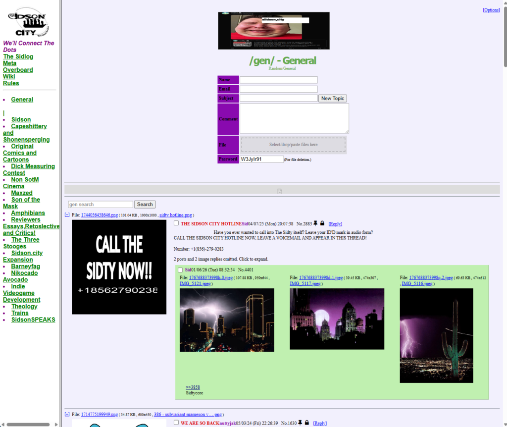 Sidson City is an anonymous imageboard (utilizing the Tinyboard/Vichan engine) that positions itself as a “refined” alternative to more chaotic boards like Soyjak.party. It is defined by its specific, often surreal, interests: