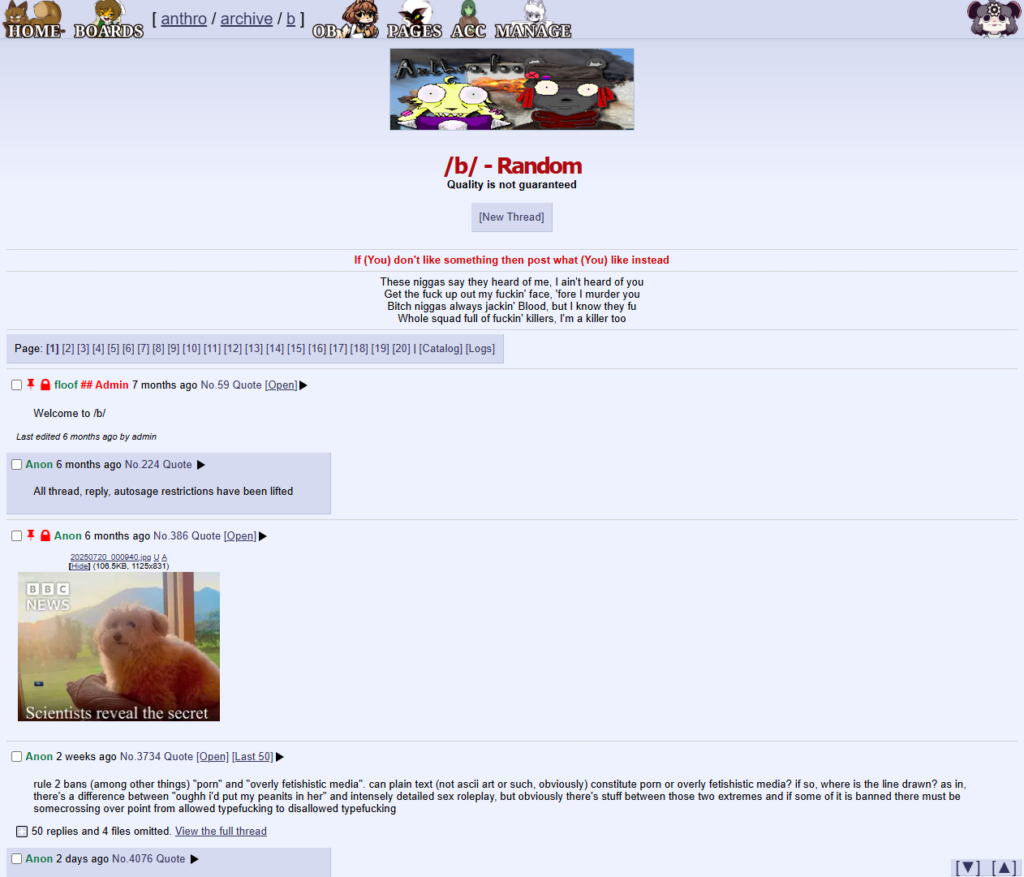Post author:All Chans Post published:January 27, 2026 Post category:Image Boards Post comments:0 Comments Tags: anthro, anthro.foo You Might Also Like End Chan June 2, 2020 Tranchan January 12, 2026 Chud January 12, 2026 Leave a Reply Cancel replyCommentEnter your name or username to comment Enter your email address to comment Enter your website URL (optional) Save my name, email, and website in this browser for the next time I comment. Attachment The maximum upload file size: 3 MB. You can upload: image. Links to YouTube, Facebook, Twitter and other services inserted in the comment text will be automatically embedded. Drop file here Δ