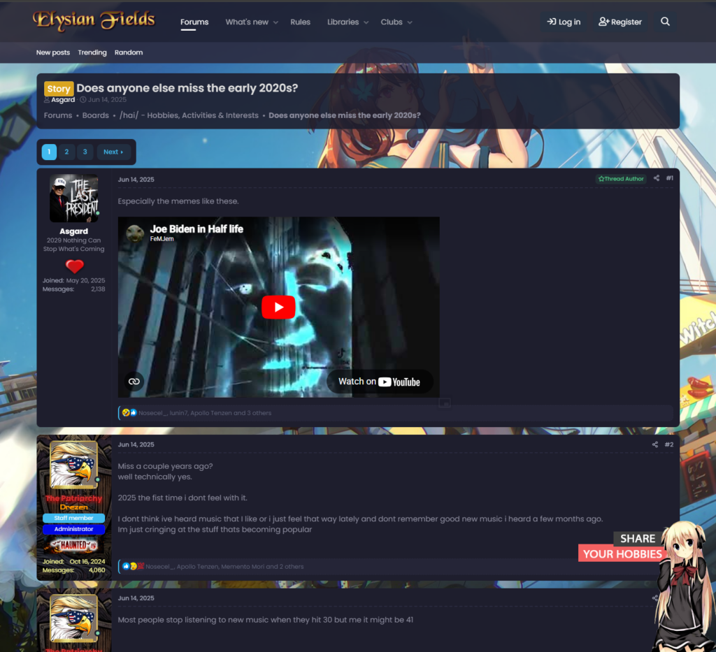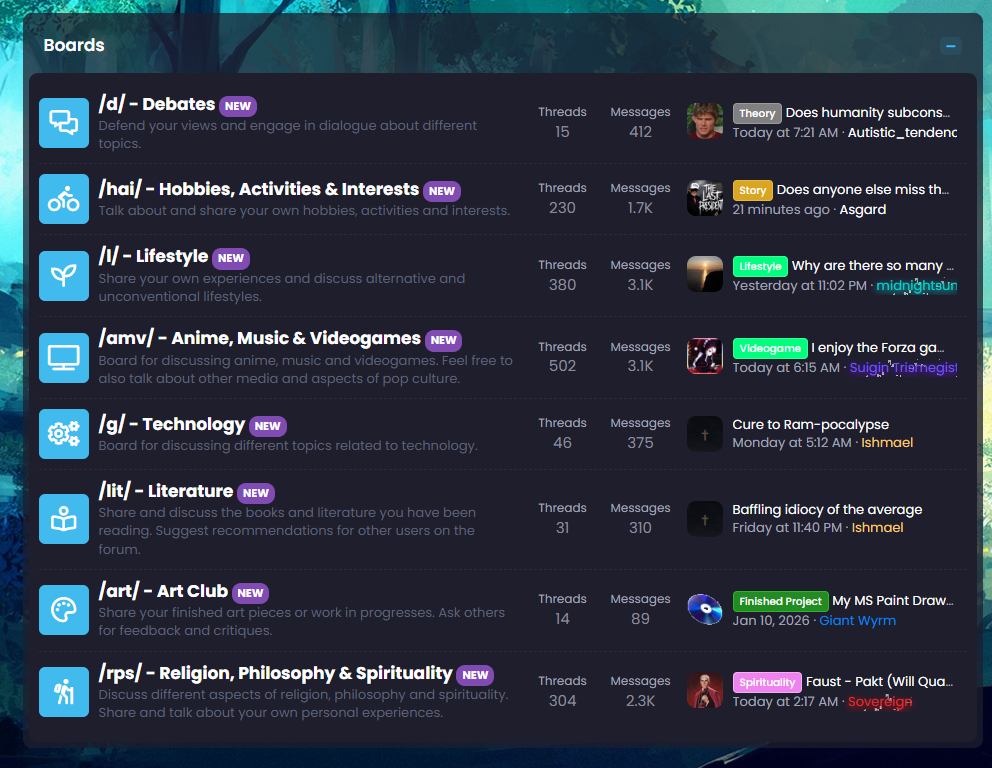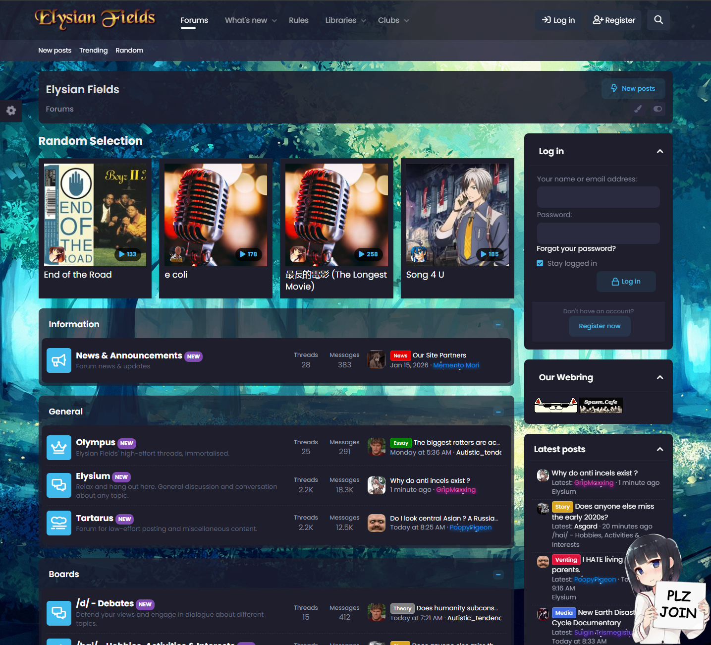 Elysian Fields is a relatively small forum created in early 2025. It began as a splinter of an existing Neet community and has now matured into a general forum for discussing various hobbies and interests. The site offers multiple boards which cater towards different topics and interests, and also offers many aesthetic user customization options and themes. As it’s a small community, the atmosphere is pretty chill and laid-back, and the users get to know each other well.