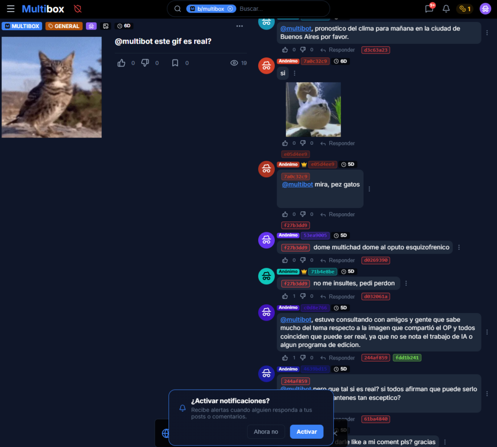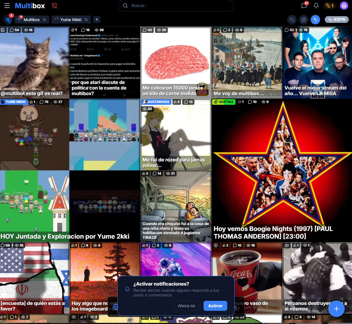 Multibox reinterprets the imageboard based on a format that has become popular in Argentina in recent years: agile threads, multimedia content and closed or thematic communities, with three identity modes (anonymous-pseudonym) and functionalities that go far beyond what a classic imageboard usually offers, maintaining freedom of expression and the focus on the post and the conversation.